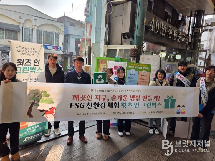 브릿지저널 김경미 기자 | 인천중구시설관리공단은 공단 임직원들이 설을 앞두고 지난 11일 신포국제시장에서 지역 주민들을 대상으로 생활 속 올바른 분리배출 실천을 유도하기 위한 체험형 친환경 행사 ‘왓츠 인 그린박스’를 진행했다고 밝혔다.