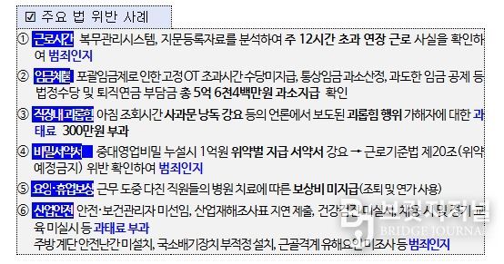 이와 함께 연장·야간·휴일근로 수당 등 임금 미지급 5억 6천4백만원에 대해서도 시정지시했다.