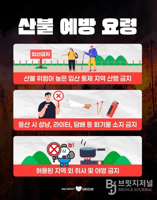 최경호 거제시 산림과장은 “설 연휴 기간은 산불 발생 위험이 매우 높은 시기인 만큼 시민 여러분께서도 산림 인접지역 소각 금지 등 산불 예방 수칙을 반드시 준수해 주시기를 당부드린다”며 “거제시는 산불 예방과 신속 대응을 위해 행정력을 집중하겠다”고 말했다.