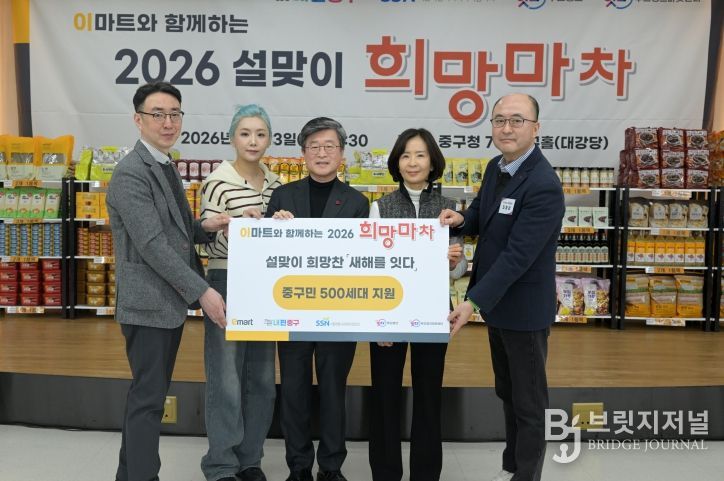 브릿지저널 김경미 기자 | 서울 중구는 설 명절을 앞둔 지난 13일 오후, 중구청 중구홀에서 서울잇다푸드뱅크센터, ㈜이마트와 함께 ‘2026 설맞이 희망마차 나눔 축제’를 열었다. 이날 행사는 관내 취약계층 500가구에 설 준비 식료품을 지원하기 위해 마련됐으며, ㈜이마트가 2,500만 원 상당의 물품을 후원했다.