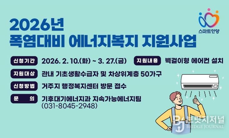 브릿지저널 김경미 기자 | 안양시는 다가오는 여름철 폭염에 대비해 저소득 취약계층을 대상으로 벽걸이형 에어컨을 설치해 주는 ‘2026년 폭염 대비 에너지복지 지원사업’을 추진 중이라고 18일 밝혔다.