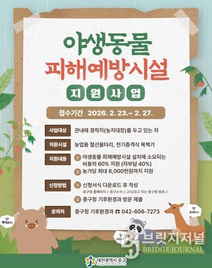 브릿지저널 정보영 기자 | 대전 중구는 오는 23일부터 야생동물에 의한 농작물 피해를 예방하기 위해 관내 경작지(농지대장)를 두고 있는 농가를 대상으로 피해예방시설 설치비 지원신청 접수를 시작한다.