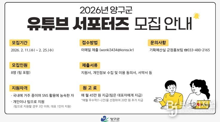 브릿지저널 윤나영 기자 | 양구군이 오는 25일까지 지역의 매력을 영상으로 생생하게 전달할 유튜브 서포터즈를 모집한다.