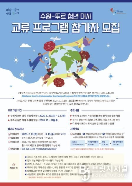브릿지저널 김경미 기자 | 수원시국제교류센터는 수원시의 국제자매도시인 프랑스 뚜르시와 추진하는 ‘2026 수원-뚜르 청년 대사 교류 프로그램’에 참여할 수원시 청년 2명을 3월 18일까지 모집한다.