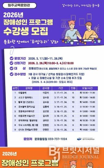 브릿지저널 윤나영 기자 | 원주교육문화관은 2월 26일부터 3월 10일까지 관내 장애성인을 대상으로 프로그램 수강생을 모집한다.