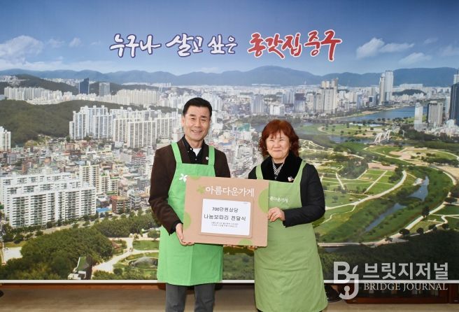 브릿지저널 윤나영 기자 | 아름다운가게 울산본부가 2월 20일 오후 2시 중구청 구청장실을 찾아 750만 원 상당의 ‘아름다운 나눔보따리’ 50개를 전달했다.