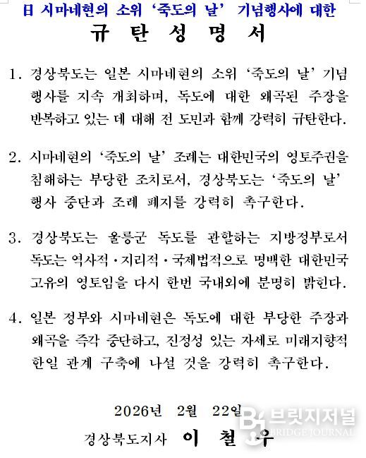 브릿지저널 정보영 기자 | 경상북도는 22일, 일본 시마네현이 소위 ‘죽도의 날’ 행사 개최에 대해 강력히 규탄하며, 행사 즉각 중단과 관련 조례 폐지를 촉구했다.
