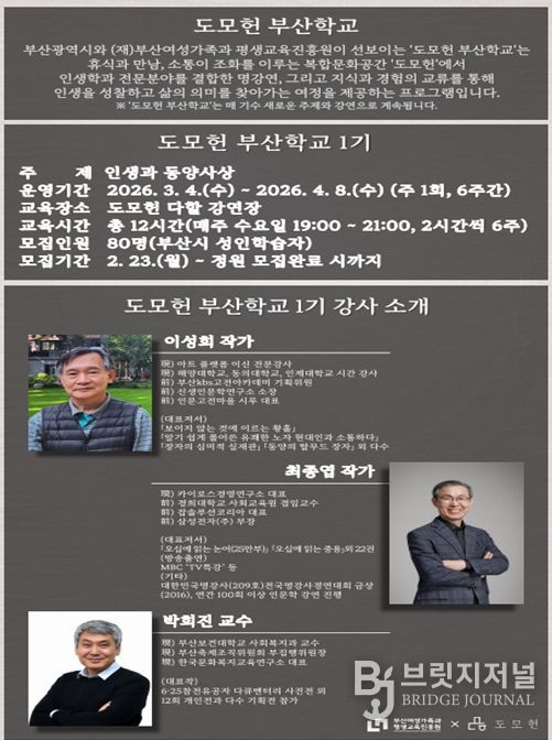 브릿지저널 윤나영 기자 | 부산시는 과거 시장 관사에서 시민을 위한 복합문화공간으로 재탄생한 '도모헌'에서 시민들의 삶에 깊이를 더하고 인생 2막의 이정표를 제시하는 '2026년 도모헌 부산학교 프로그램'을 본격 운영한다고 밝혔다.