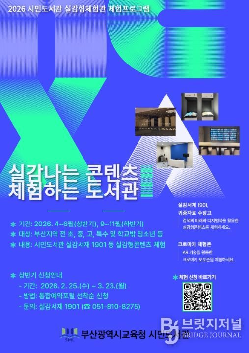 브릿지저널 윤나영 기자 | 부산시교육청 시민도서관은 4월부터 11월까지 시민도서관에서 부산 지역 초·중·고·특수 학생과 학교 밖 청소년을 대상으로 실감형 콘텐츠 기반 미래형 독서 서비스 ‘실감나는 콘텐츠, 체험하는 도서관’을 운영한다.