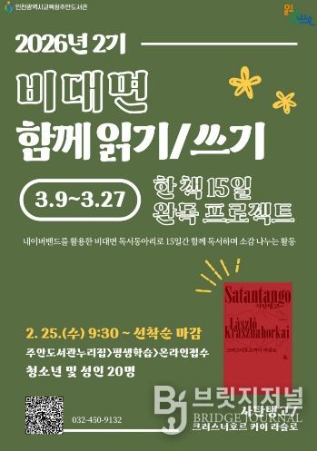 이번 프로그램은 정지선 독서지도 전문 강사의 안내에 따라 ‘사탄 탱고’를 함께 읽으며, 네이버 밴드를 활용해 감상평을 공유하고 한 권의 책을 15일간 완독하는 방식으로 3월 9일부터 27일까지 운영한다.
