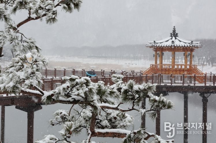 브릿지저널 김경미 기자 | 대설주의보가 내린 24일 하얀 눈이 소복이 내려앉은 충북 괴산군 동진천 옆 소나무길이 겨울 정취를 물씬 풍기고 있다.