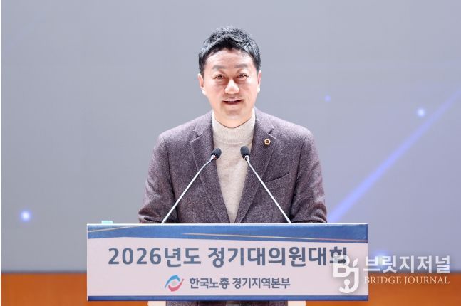 브릿지저널 윤나영 기자 | 경기도의회 김진경(더민주·시흥3) 의장은 24일 열린 한국노총 경기지역본부(의장 김연풍) 2026년 정기대의원대회에서 노동자가 중심이 되는 노동의 지속가능성을 강조했다.