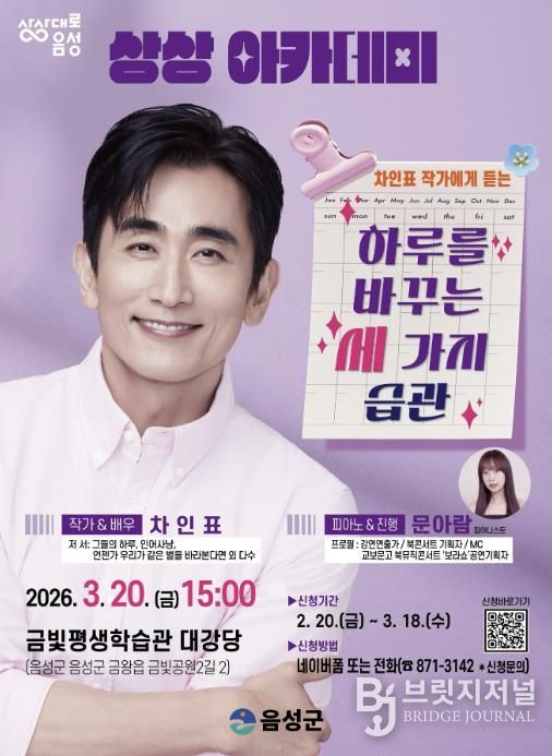 브릿지저널 김경미 기자 | 음성군은 오는 3월 20일 오후 3시 금왕읍 금빛평생학습관에서 배우이자 작가로 활동 중인 차인표 작가를 초청해 상상 아카데미 강연을 개최한다고 밝혔다.