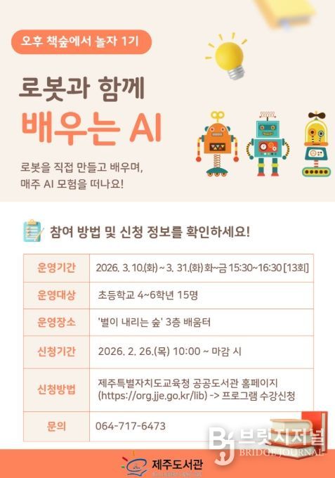 브릿지저널 정보영 기자 | 제주도교육청 제주도서관은 25일 방과 후 어린이를 대상으로 도서관 공간을 활용한 체험 중심 프로그램 ‘2026 오후 책숲에서 놀자’ 1기 ‘로봇과 함께 배우는 인공지능(AI)’ 참가자를 모집한다.