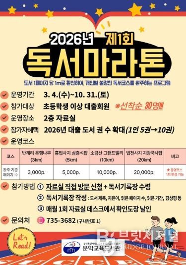 브릿지저널 윤나영 기자 | 문막교육도서관은 관내 이용자의 지속적인 독서 습관 형성 및 함께 읽는 독서문화조성을 위해 2026년 제1회 ‘독서마라톤’을 운영한다.