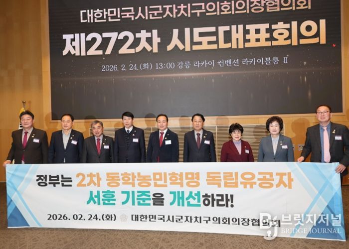 브릿지저널 윤나영 기자 | 대한민국시군자치구의회의장협의회가 지난 24일 강원 강릉 라카이 컨벤션에서 열린 제272차 시도대표회의에서 2차 동학농민혁명 참여자의 독립유공자 서훈 인정을 위한 법령 개정을 촉구했다.