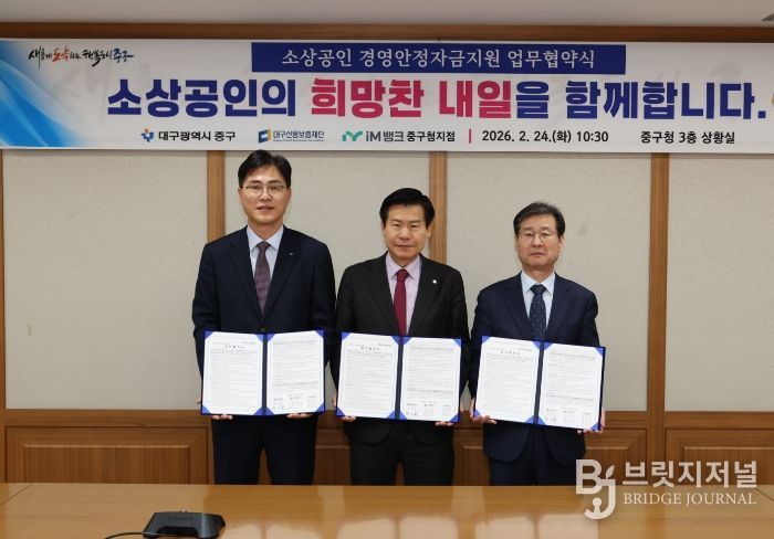 브릿지저널 김진석 기자 | 대구신용보증재단이 2월 24일 중구청 상황실에서 중구청, iM뱅크 중구청지점과 소상공인 경영안정 지원을 위한 업무협약을 체결했다.