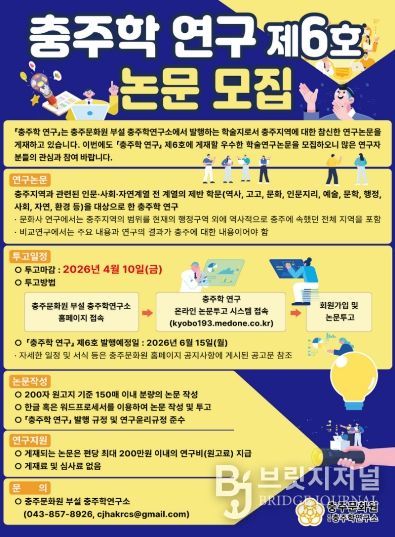 브릿지저널 김경미 기자 | 충주문화원(원장 유진태) 부설 충주학연구소(소장 이성호)는 오는 4월 10일까지 참신한 내용의 충주학 연구논문과 학술연구과제를 모집한다고 밝혔다.