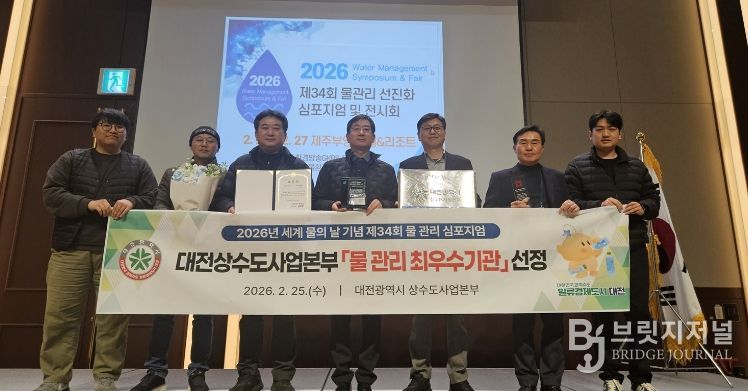 대전시는 25일 제주에서 개최된 ‘제34회 물 관리 심포지엄’에서 ‘2026년 물 관리 최우수기관’으로 선정됐다고 밝혔다. 이와 함께 수질연구소 이경춘 급수관리팀장이 ‘물 관리 달인’으로 선발되며 기관과 개인 부문을 동시에 석권하는 겹경사를 맞았다.