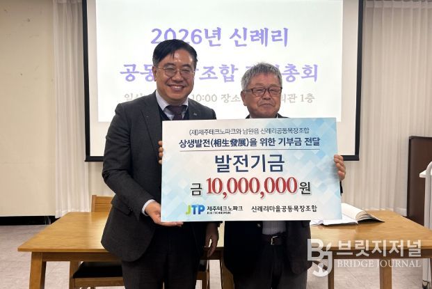 브릿지저널 정보영 기자 | 신례리공동목장조합(조합장 양춘식)과 20년 넘게 상생협력을 이어오고 있는 제주테크노파크(원장 지영흔, 제주TP)가 발전기금을 쾌척했다.