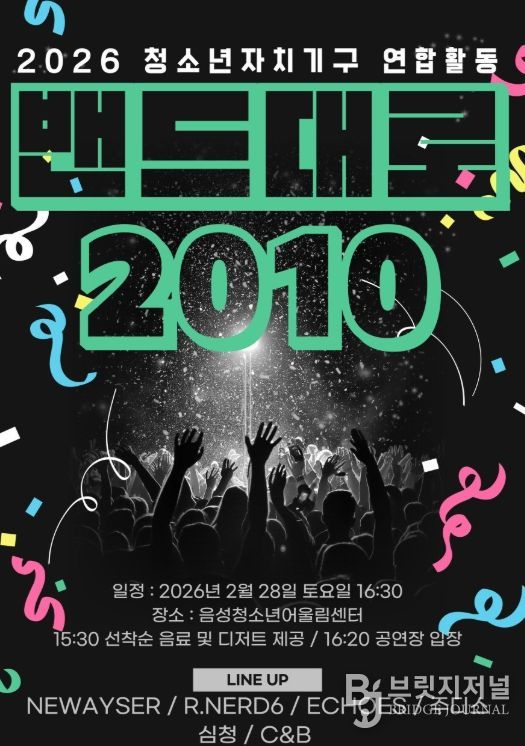 브릿지저널 김경미 기자 | 음성군은 이달 28일 음성청소년어울림센터에서 2026년 청소년자치기구 연합활동 ‘밴드대로 2010’을 개최한다고 밝혔다.