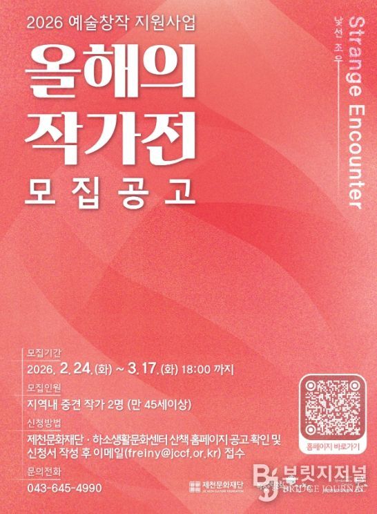브릿지저널 김경미 기자 | 제천문화재단이 지역 시각예술 분야의 역량 있는 중견 작가를 발굴하고 창작 활동을 지원하기 위해 2월 24일부터 3월 17일까지'올해의 작가전' 참여 작가를 공개 모집한다.