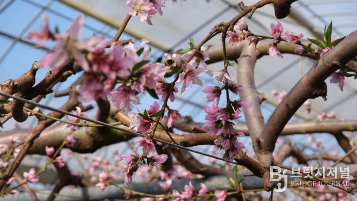 브릿지저널 김경미 기자 | 충북 영동군 시설하우스 내에 겨울 한파를 이겨내고 피어난 복사꽃과 플럼코트 꽃이 만발했다.