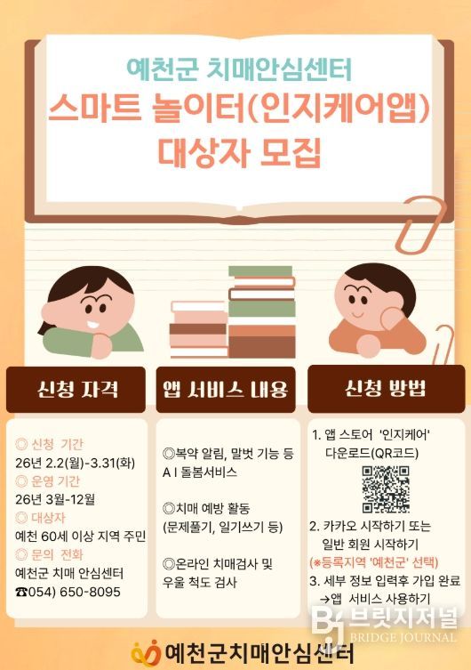 한편, 신규 가입자를 독려하기 위해 3월 한 달간 앱 내에서 ‘일기 쓰기’를 10회 이상 작성한 참여자에게는 편의점 5천 원 쿠폰을 증정하는 특별 챌린지를 진행할 예정이며, 사업과 관련한 자세한 문의는 예천군 치매안심센터로 하면 된다.