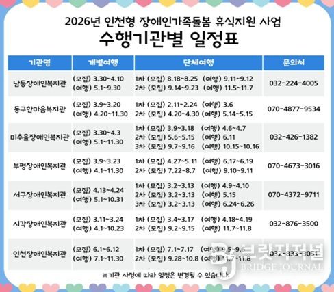 브릿지저널 김경미 기자 | 인천광역시는 장애인가족의 심리적 안정과 가족기능강화를 위해 2016년부터‘인천형 장애인가족 휴식지원’사업을 지속적으로 운영하고 있다고 밝혔다.