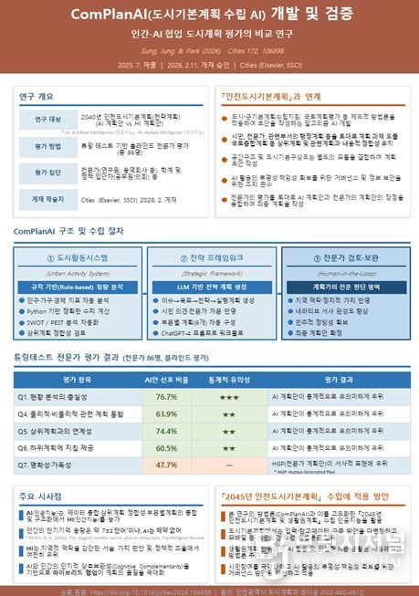 해당 방법론은 국제적으로도 이미 검증을 마쳤다. 2040년 인천도시기본계획 변경 수립 경험을 바탕으로 인공지능과 인간의 계획 특성을 비교·분석한 연구 '컴플랜에이아이를 활용한 도시계획(Planning with ComPlanAI)'은 2026년 2월 21일 사회과학인용색인(SSCI) 등재 도시계획 분야 최상위 국제학술지인 Cities(시티즈)에 게재됐다.