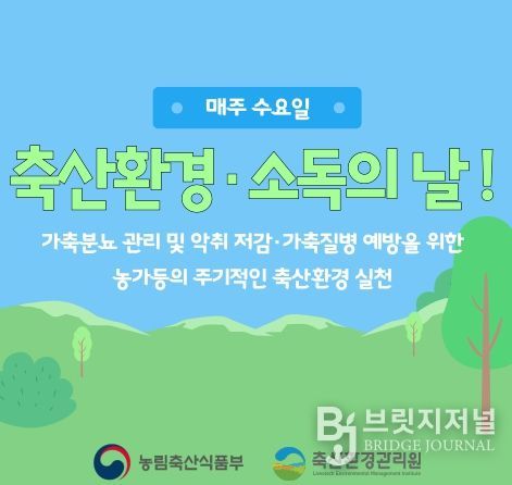 한편, 농림축산식품부는 매주 수요일을 ‘축산환경·소득의 날’로 지정하여 축산농가와 관련 시설이 소독, 청소 및 구서(쥐를 잡아 없애는 일), 구충 방제 등 축산환경 개선 활동을 실천할 수 있도록 독려하고 있으며, 자율적인 참여 분위기 조성을 통해 쾌적한 축산환경 조성에 힘쓰고 있다.
