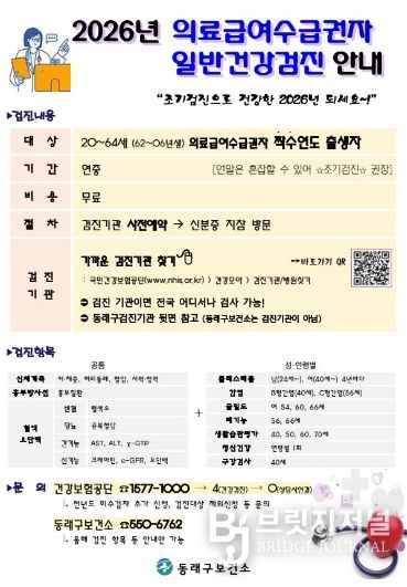 브릿지저널 윤나영 기자 | 부산 동래구는 의료취약계층의의 질환을 조기에 발견하고 건강 증진을 도모하기 위해 ‘의료급여 수급권자 일반건강검진’ 수검을 적극 독려하고 있다고 밝혔다.