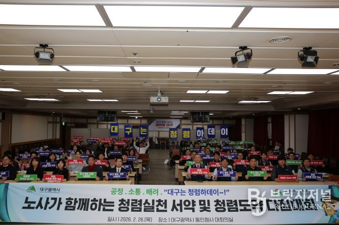브릿지저널 김진석 기자 | 대구광역시는 2월 26일 ‘노사가 협력해 공직을 혁신한다’는 목표 아래 공직사회 청렴문화 확산과 실천 의지를 표명하기 위해, 대구공무원노동조합과 공동으로 ‘노사가 함께하는 청렴실천 서약 및 청렴도약 다짐대회’를 개최했다.