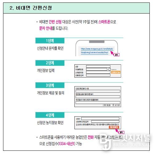 금년의 경우 신청 편의성 제고를 위해 스마트폰 등을 이용한 비대면 신청기한을 1개월에서 3개월로 확대했다. 신청일 기준으로 농업경영체 등록정보가 지난해와 변동이 없는 농업인은 비대면 간편신청이 가능하며, 별도의 서류 제출 없이 스마트폰이나 전화자동응답시스템(ARS)를 이용해 신청이 가능하다. 이들에게는 문자메시지(SMS) 등을 통해 3월 3일부터 신청을 안내할 예정이다. 또한, 간편신청이 불가한 농업인·법인은 인터넷에 접속하여 비대면 신청이 가능하도록 신청방식을 추가 도입하여 농업인들이 보다 편리하게 신청할 수 있게 했다.