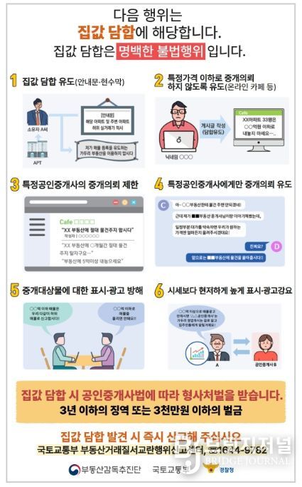 김용수 부동산감독추진단장은 “정부는 가격담합 등 부동산 시장질서를 교란하는 행위에 대해 관계기관과 긴밀히 협력하여 엄정하게 대응해 나가겠다”고 밝혔다.