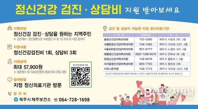 브릿지저널 정보영 기자 | 제주보건소는 시민의 정신건강증진과 조기 치료 연계를 위해 ‘정신건강검진비 및 상담비’를 지원한다.