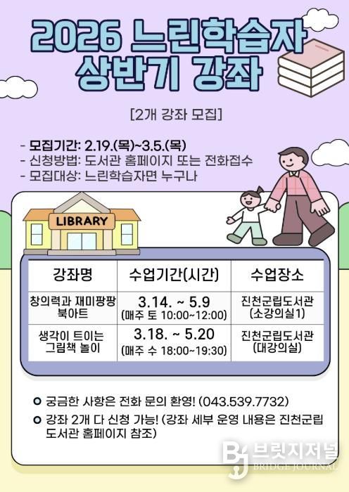 브릿지저널 김경미 기자 | 충북 진천군립도서관이 모두에게 열린 공간을 제공하고 정보 불평등을 해소하기 위해 느린 학습자를 위한 독서문화 프로그램 참여자를 모집한다.