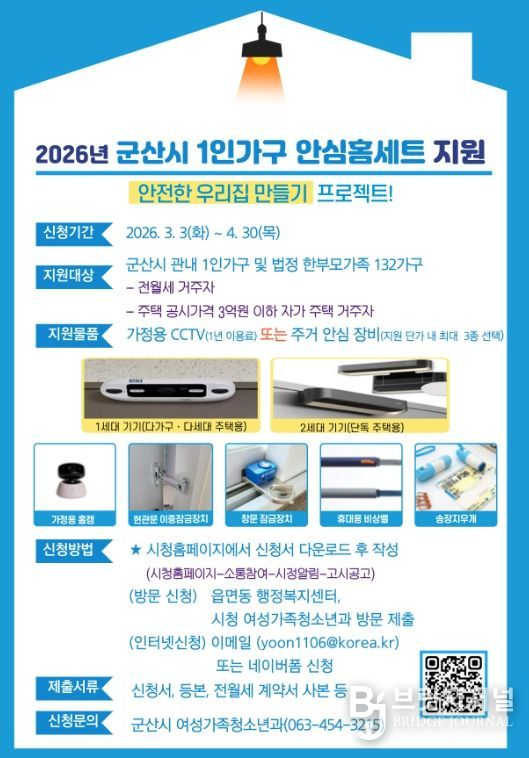 브릿지저널 윤나영 기자 | 군산시는 1인 가구와 한부모가족의 주거 안전 강화를 위해 ‘2026년 군산시 1인가구 안심홈세트 지원사업’을 추진하고, 3월 3일부터 4월 30일까지 대상자를 모집한다고 밝혔다.