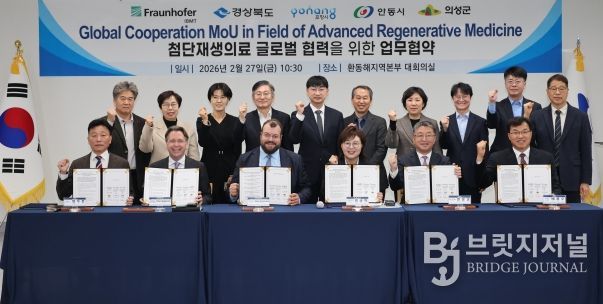 브릿지저널 정보영 기자 | 포항시는 27일 경상북도 동부청사에서 경상북도, 안동시, 의성군과 함께 독일 프라운호퍼 생체의공학 연구소(IBMT)와 ‘첨단재생의료산업 육성을 위한 공동 협력 양해각서(MOU)’를 체결했다.