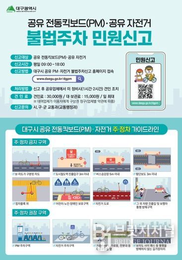 브릿지저널 김진석 기자 | 대구광역시는 전동킥보드 등 개인형 이동장치(PM)의 불법주차 문제를 해소하기 위해 ‘대구광역시 공유 PM불법주차 신고’ 시스템을 구축하고, 3월 3일부터 모바일 웹 기반 민원신고 서비스를 시행한다.