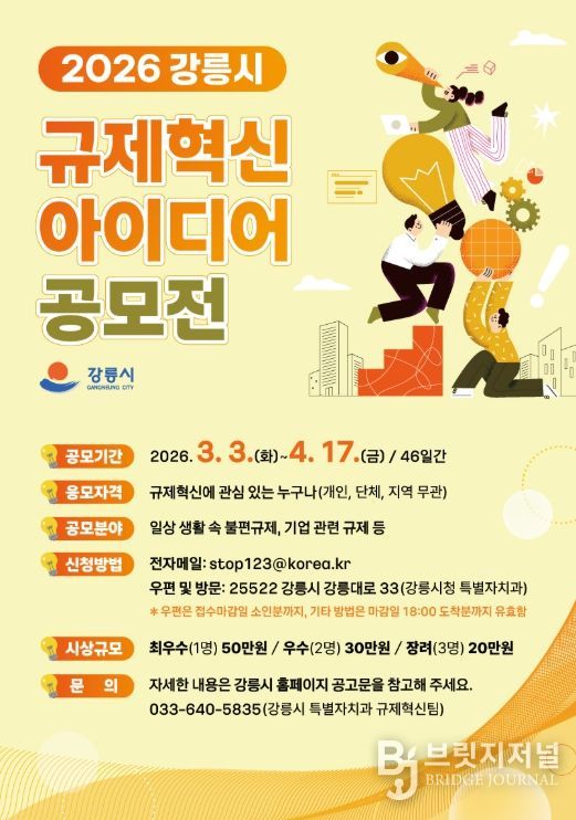 브릿지저널 윤나영 기자 | 강릉시는 시민이 겪고 있는 생활 규제와 기업들이 직면하고 있는 불합리한 기업 활동 규제를 발굴·개선하기 위해 전 국민을 대상으로 규제혁신 공모전을 개최한다.