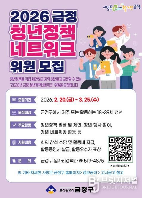 브릿지저널 윤나영 기자 | 부산 금정구는 2월 20일부터 3월 25일까지 2026 금정 청년정책네트워크 위원을 모집한다.