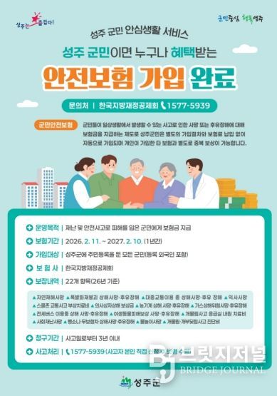 브릿지저널 정보영 기자 | 성주군은 재난이나 일상생활에서 발생할 수 있는 각종 사고 피해를 보상하는 ‘성주군 군민안전보험’가입으로 군민들의 생활 안정과 촘촘한 사회안전망을 구축에 앞장섰다.