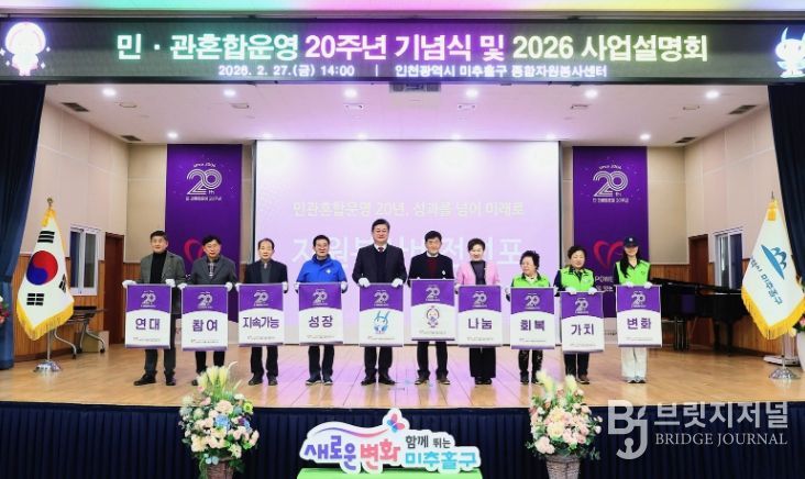 브릿지저널 김경미 기자 | 인천 미추홀구종합자원봉사센터는 지난 27일 미추홀구청 대회의실에서 ‘2026년 자원봉사센터 사업설명회 및 20주년 기념행사’를 진행했다.