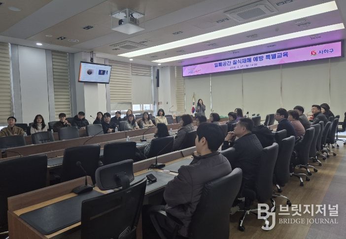 브릿지저널 윤나영 기자 | 부산 사하구는 지난 2월 27일 사하구청 재난안전상황실에서 한국산업안전보건공단 부산광역본부 산업보건부장 박현희 강사를 초빙해 밀폐공간 담당 직원을 대상으로 ‘밀폐공간 질식재해 예방 특별교육’을 실시했다.
