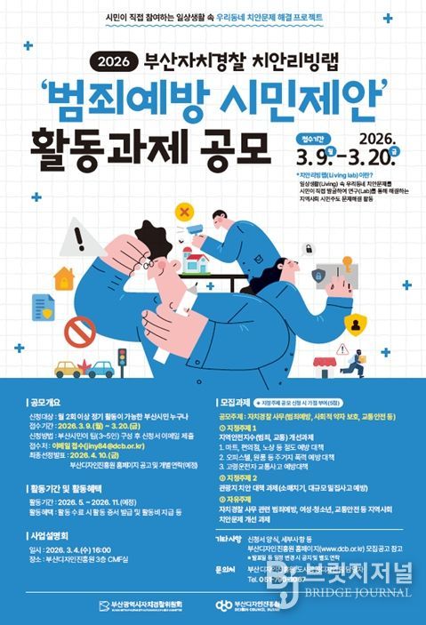 브릿지저널 윤나영 기자 | 부산시 자치경찰위원회는 (재)부산디자인진흥원과 함께 오는 3월 9일부터 20일까지 '2026년 부산자치경찰 치안리빙랩 공모전'을 개최한다고 밝혔다.