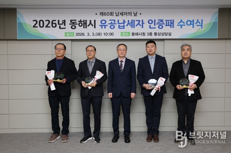 브릿지저널 윤나영 기자 | 동해시는 3월 3일 '제60회 납세자의 날'을 맞아 시청 통상상담실에서 유공납세자 인증패 수여식을 열고 성실납세자들에게 감사의 뜻을 전했다.