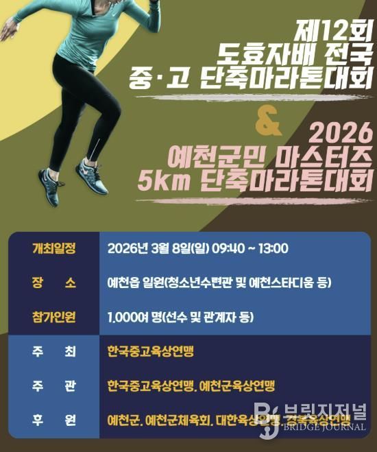 브릿지저널 정보영 기자 | 예천군은 오는 8일 오전 10시부터 예천읍 일원에서 '제12회 예천 도효자배 전국 중·고 단축마라톤대회' 및 '2026 예천군민 마스터즈 단축마라톤대회'를 개최한다고 밝혔다.