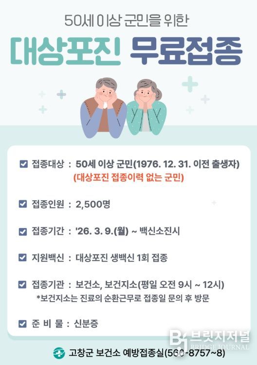 유병수 고창군 보건소장은 “대상포진은 예방이 가장 중요한 질환”이라며 “군민 여러분께서는 이번 무료 예방접종을 통해 건강을 지키고, 안심할 수 있는 생활을 이어가시길 바란다”라고 밝혔다.