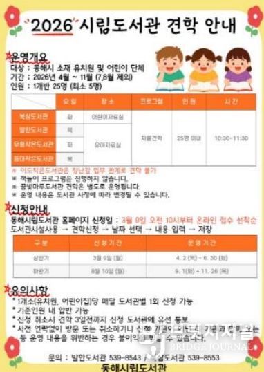 견학를 희망하는 유치원 및 어린이집은 동해시립도서관 홈페이지를 통해 접수하면 되고, 기타 자세한 사항은 도서관 사무실로 문의하면 된다.